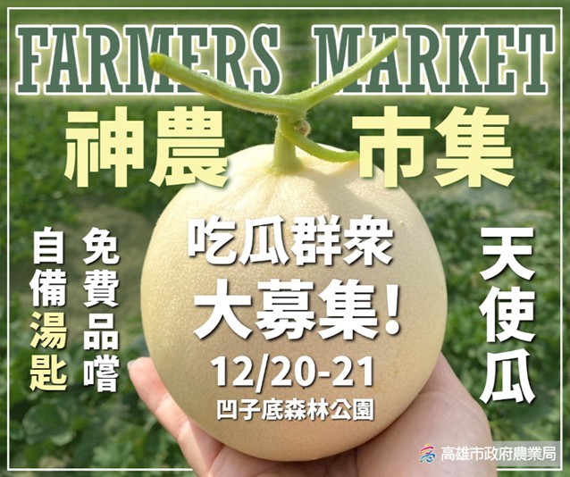 高雄優質農產歲末壓軸登場!由高雄市政府農業局主辦的「神農市集」,將於12月20日至21日在凹子底森林公園熱鬧舉行。本月市集以「農情瓜香」為主題,首度發表全新洋香瓜品種「天使瓜」,並發起別開生面的「千人吃瓜」活動,邀請民眾自備湯匙到場免費品嚐,為年終週末增添甜蜜又有趣的農業饗宴。