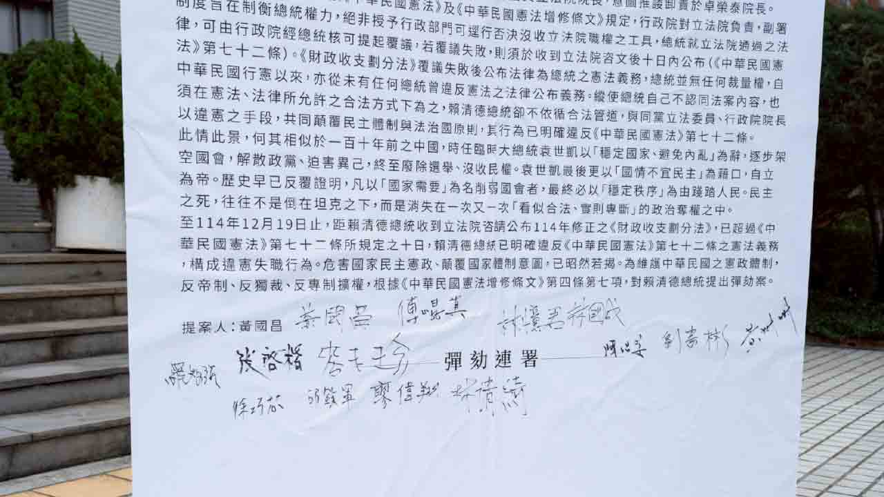 行政院長卓榮泰決定不副署立法院三讀通過、覆議失敗的《財政收支劃分法》修正案,引發朝野激烈對立。總統賴清德除錄影聲援卓榮泰外,更批評在野黨「國會濫權」、「在野獨裁」,政治緊張情勢持續升溫。國民黨與民眾黨立法院黨團今(19)日共同召開記者會,正式宣布將對賴清德提出彈劾案,並將展開全國公聽會,要求總統赴立法院報告說明。