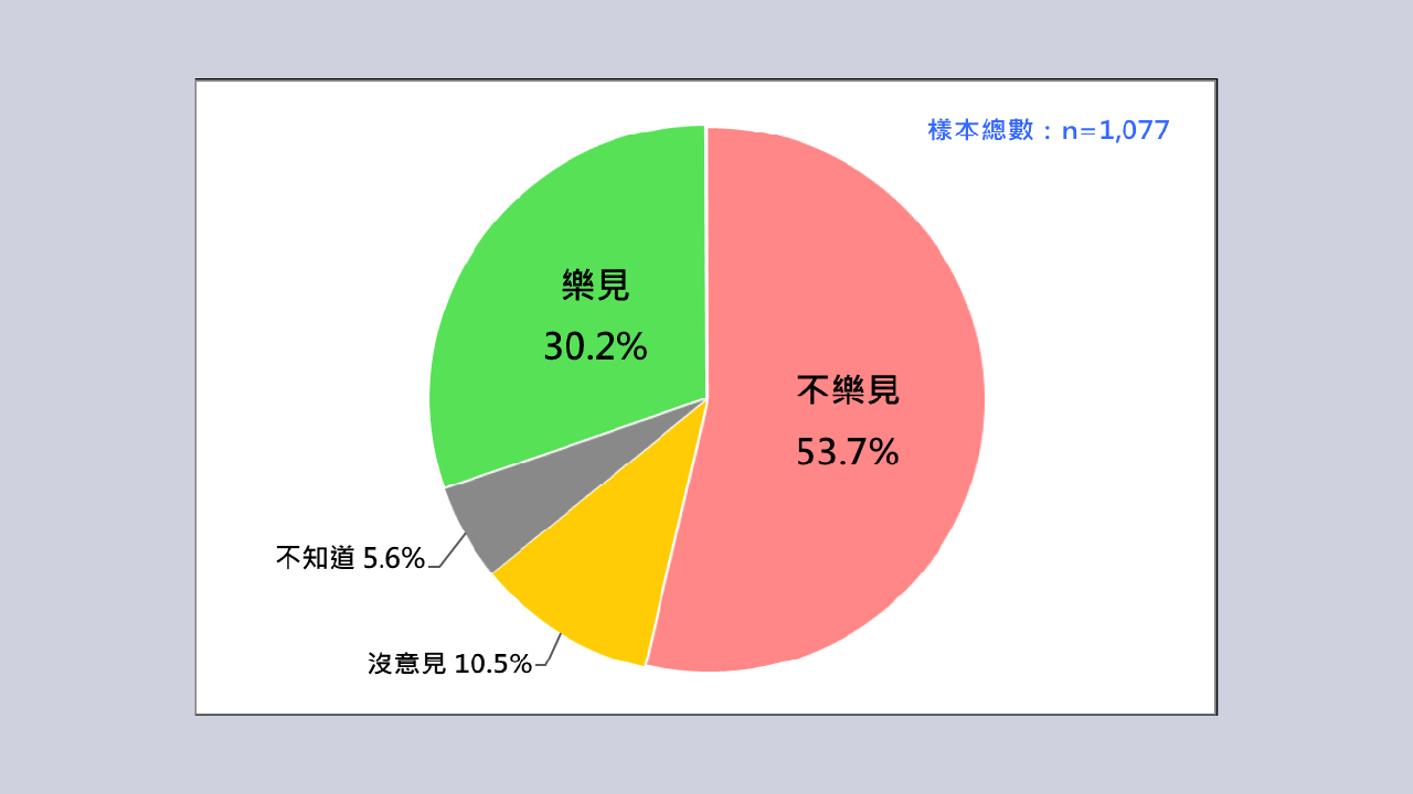 進一步從年齡層觀察,各年齡族群中,不樂見比例普遍高於樂見比例,但不同世代間仍存在差距。例如25至34歲族群中,37%表示樂見、49%不樂見;65歲以上族群則有20%樂見、57%不樂見,顯示不同年齡層對相關議題的態度強度有所不同。