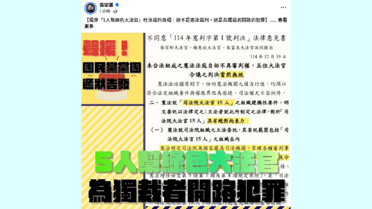 國民黨立法院黨團今日採取大動作法律行動,正式向檢方遞狀告發5位大法官涉犯《刑法》第124條「枉法裁判罪」。國民黨立委吳宗憲痛批,現今的憲法法庭已淪為貫徹「清德宗」獨裁意志的工具,這5位「綠色大法官」無視憲法剛性門檻,違法召開會議並做出判決,國民黨團絕不妥協。