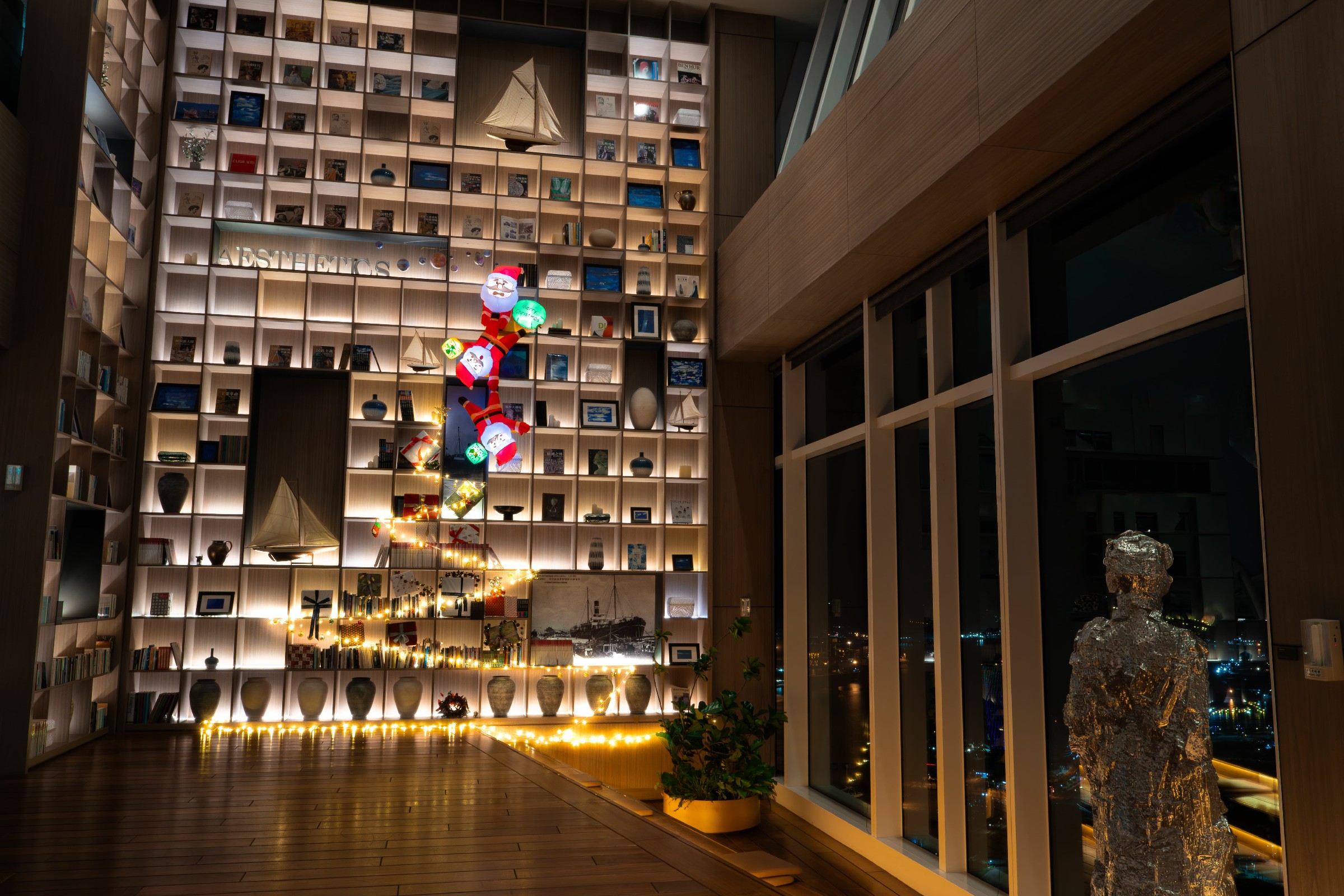 ↑圖說:二十五樓閱讀廣場的「聖誕書」,結合挑高書牆與落地窗景,夜晚映照城市燈海,讓書香、光影與聖誕意象相互交織。(圖片來源:承億酒店提供)
