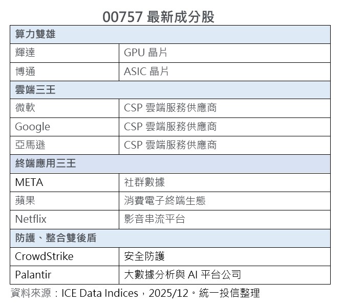 統一FANG+ ETF(00757)經理人林良一指出,FANG+指數成分股在AI各環節居主導地位,從算力與網絡基礎設施(輝達、博通)、雲端平台(微軟、Google、亞馬遜)、模型開發與終端應用(META、蘋果、 Netflix),到AI驅動的安全防護(CrowdStrike),已形成強大生態。