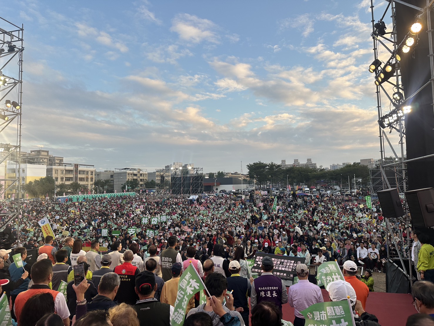 民進黨高雄市長初選參選人、立法委員林岱樺27日於鳳山舉辦壓軸大造勢,活動現場湧入大批支持群眾,主持人宣布現場突破10萬人,直播空拍畫面顯示場地全數滿座,周邊人潮持續外溢,創下同場地民進黨市長初選活動人數新高,林岱樺登台,現場群情激動,高喊「加油」、「凍蒜」,支持者情緒達到高點。