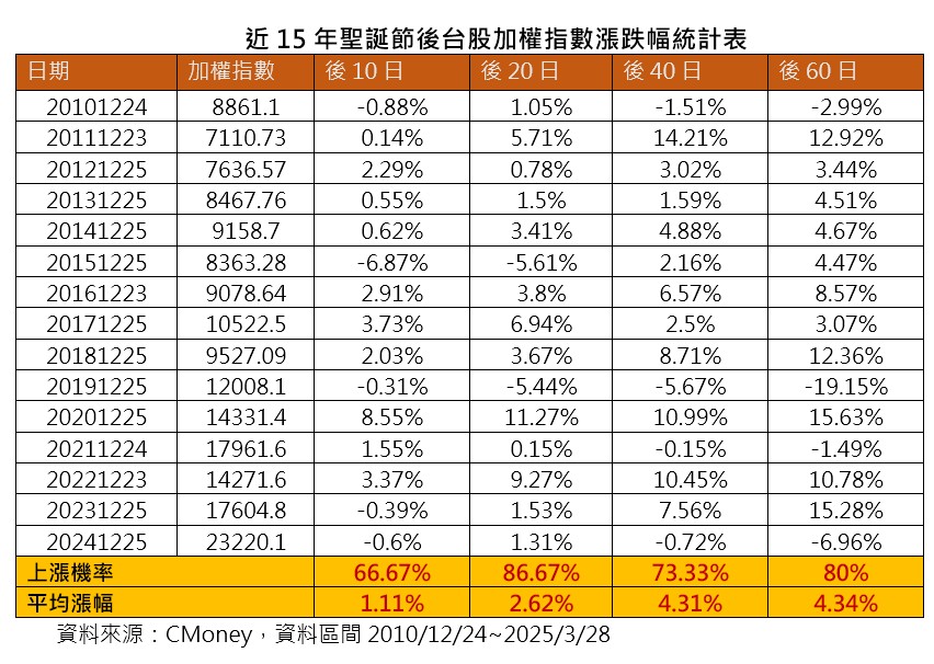 統一投信指出,根據CMoney統計近15年聖誕節後台股加權指數漲跌表現,節後10日指數上漲機率達66.67%;20日後更高達86.67%,平均漲幅2.62%。