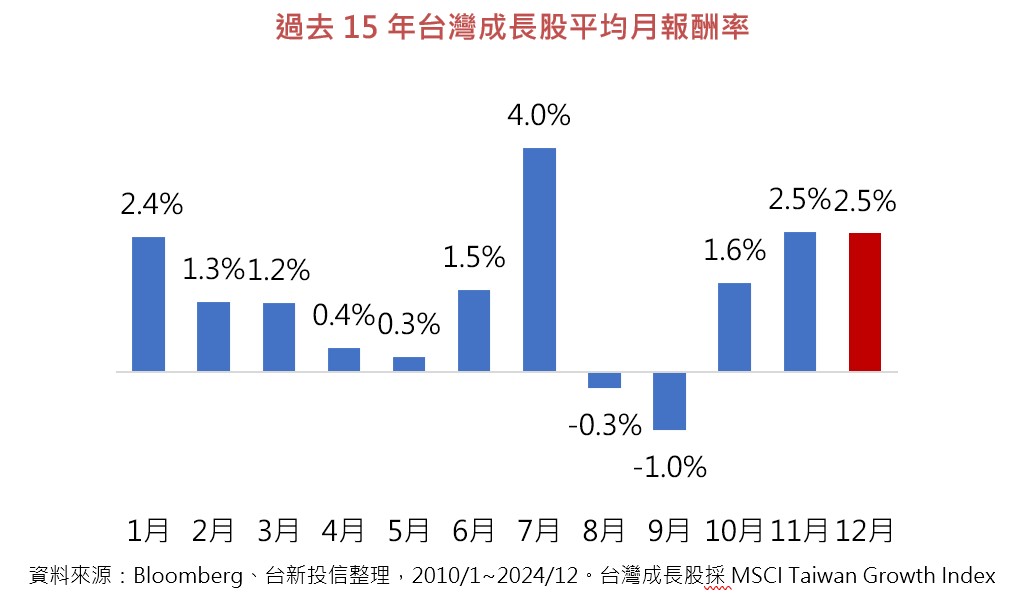 另外加上美國經濟在川普「大而美法案」財政激勵、聯準會降息以及AI資本支出的支撐下,可望避免經濟衰退的風險。在AI需求帶動下,2026年台灣成長股以及國際股市獲利成長可望逐季走升,展現強勁多頭氣勢。且據統計,近15年台灣成長股12月至隔年上半年,月月正報酬。
