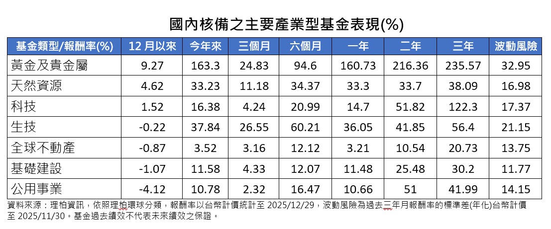 主要產業型基金來看,黃金貴金屬股票型基金12月平均上漲9.27%,再度勇冠各類基金;今年以來狂飆163.3%,更是驚人,毫無懸念地遙遙領先各類基金。