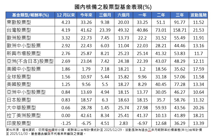 主要區域股票型基金來看,受惠俄烏停火契機重現,以及AI概念股上漲,12月以來,東歐股票型基金和台股基金平均上漲4.23%和4.19%,領先主要國家。相對地,投資人苦等不到印度與美國洽商貿易協議,外資撤出拖累印度股票型基金12月平均逆勢下跌1.25%,今年平均下跌6.7%,也是墊底的基金。