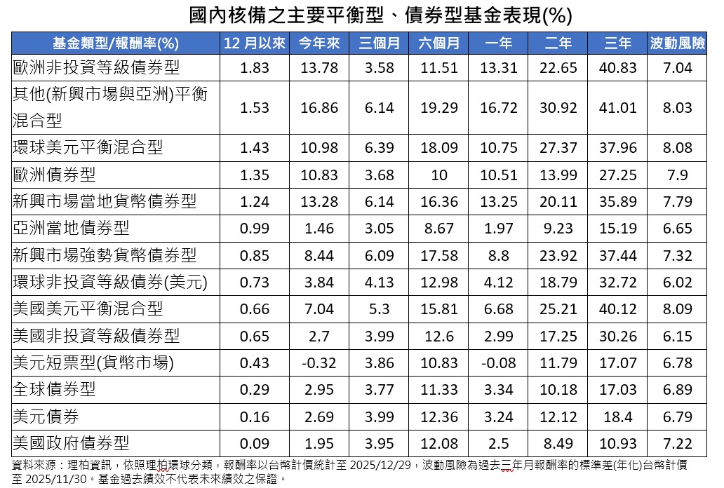 海外基金12月暨2025年績效搶先看!總計本月以來截至29日,金管會證期局核備的956檔境外基金(包括股、債、平衡型、票券、另類投資)平均上漲1.48%,其中,621檔股票型基金平均上漲1.84%,55檔混合資產(平衡型)基金平均上漲1.58%;258檔債券型基金平均上漲0.65%。