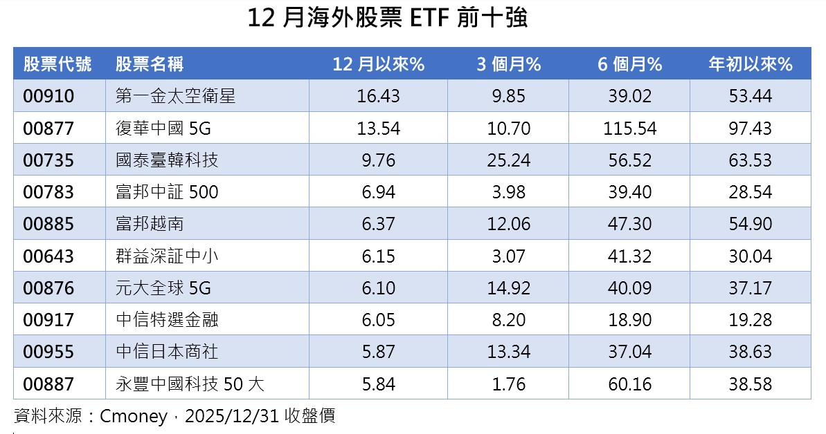 2025年海外股票ETF報酬出爐!復華中國5G(00877)漲幅高達97.43%,表現最佳,其後依序是國泰臺韓科技(00735)、元大航太防衛科技(00965)、富邦越南(00885),第一金太空衛星(00910),前五強報酬都超過5成。