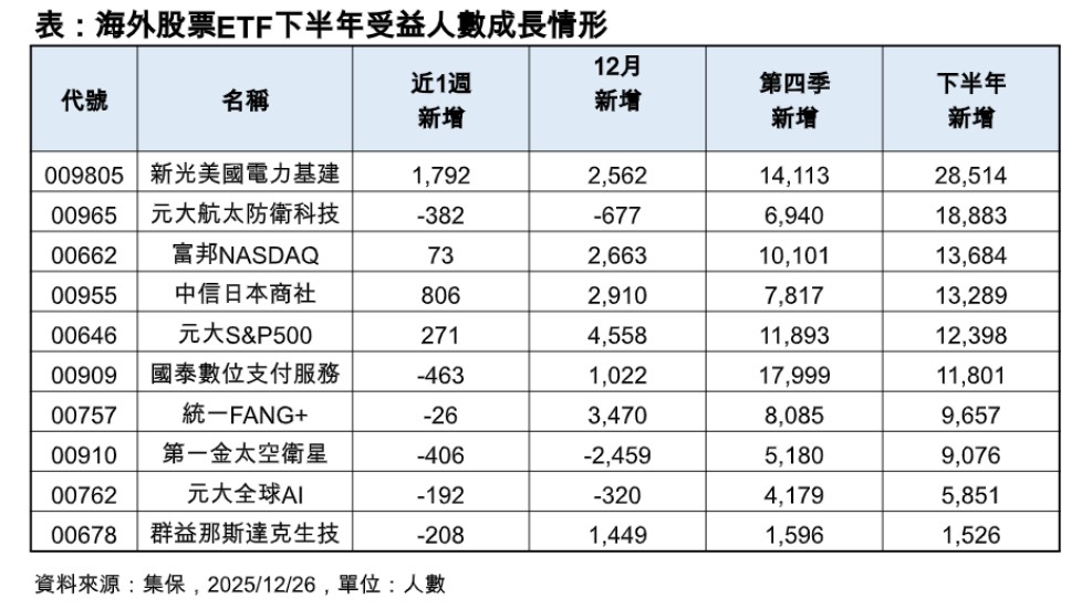 其中,新光美國電力基建(009805)人氣最旺,下半年來新增逾2.8萬人搶進,成2025下半年海外ETF申購人氣王;元大航太防衛(00965)下半年成長逾1.8萬人排名第二,同樣具高人氣表現,至於富邦NASDAQ(00662)、中信日本商社(00955)、元大S&P 500(00646)與國泰數位支付(00909),下半年人數也增加逾萬人。