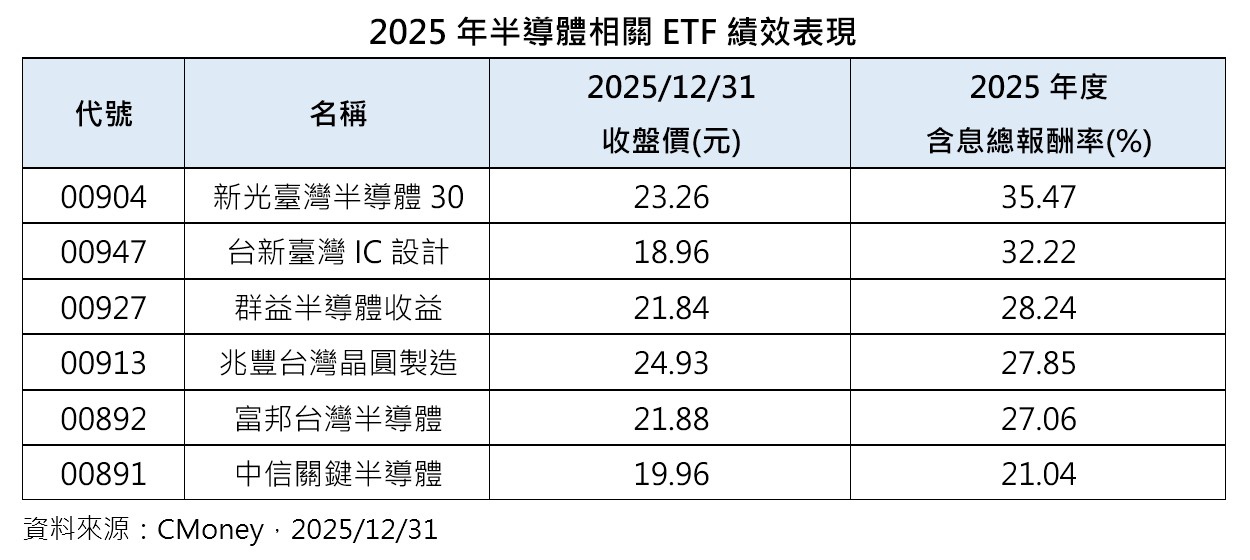 (00904)新光臺灣半導體30 ETF,2025年含息總報酬率衝出35.47%,勇奪台股6檔半導體相關ETF績效冠軍;此外,00904將於明(2026)年1月16日除息,預估配息0.76元,再創歷史新高,投資人如果想參與收益分配,最後買進日為明年1月15日。