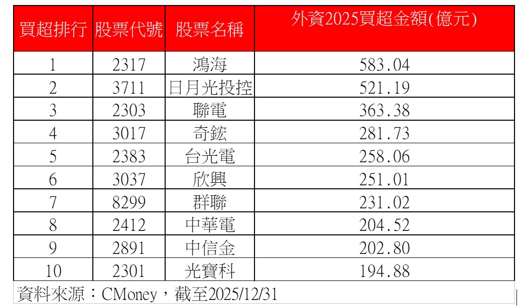 至於今年獲外資青睞的個股,首推鴻海,大舉買超583億元,不但把去年賣超461億元的部位全數回補,甚至還加碼百餘億。另外,日月光投控、聯電等等也獲得外資加持。