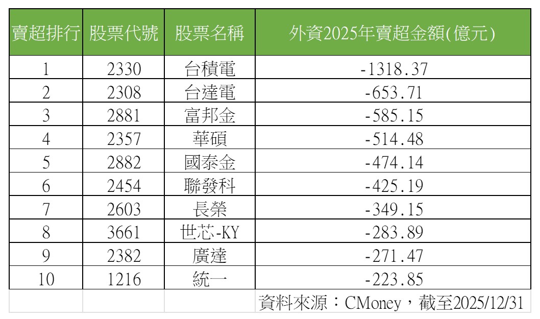 外資2025狂賣台股近6千億!前10大棄養股、認養股 看表秒懂