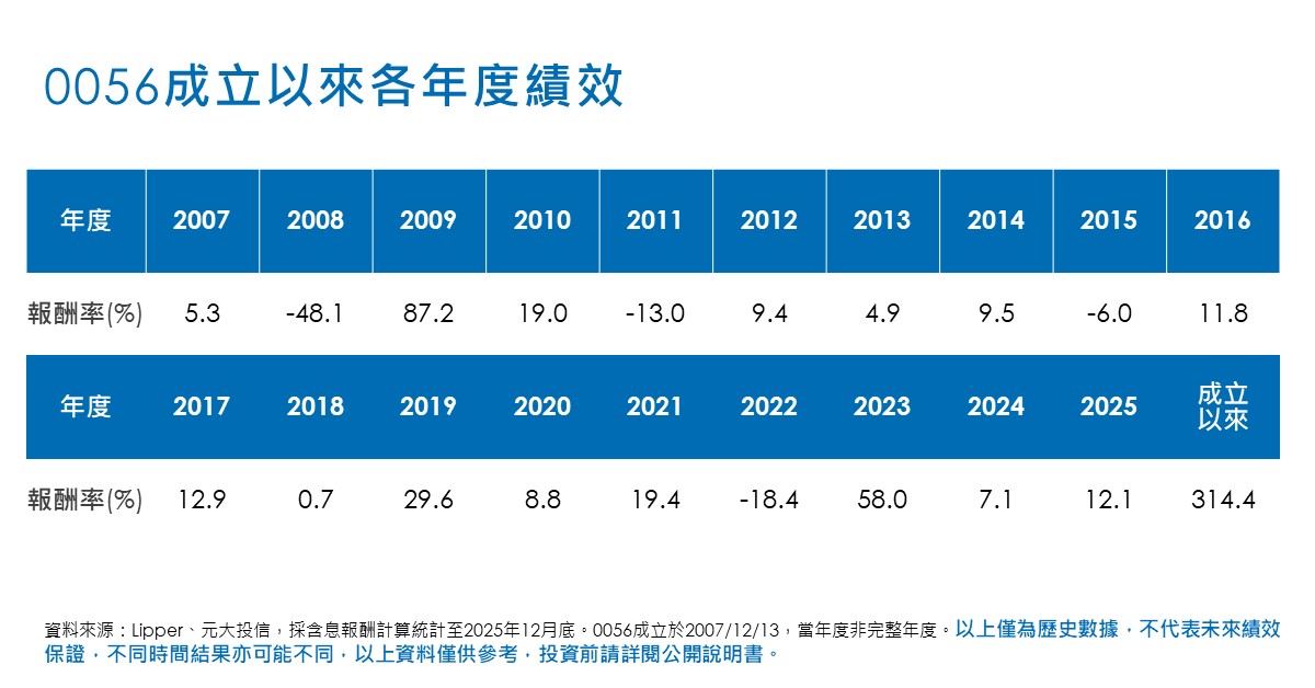 同時,0056追蹤的臺灣高股息指數持續與時俱進,除了2023年擴充成分股至50檔,降低個股影響性,2025年再針對成分股財務透明度、股利預測準確度,以及股價表現穩定度新增檢核標準,持續優化投資組合。