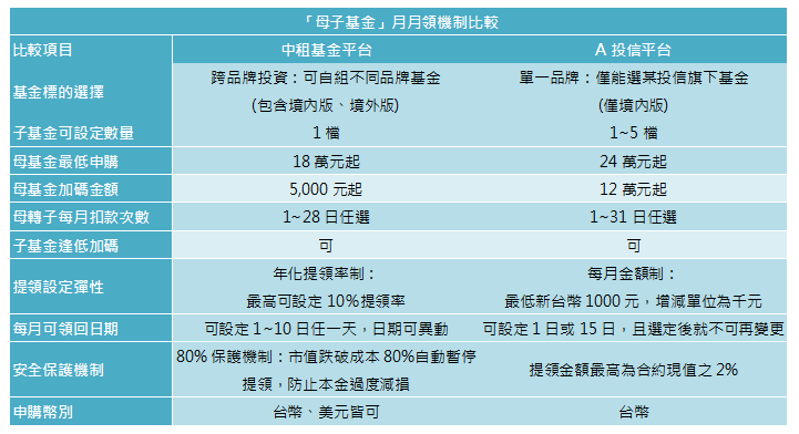 目前國內基金銷售通路中,具備母子基金「月月領」功能的平台僅有中租基金平台與另一家投信平台。中租基金平台雖然為後進者,但功能進化更齊全,特別是調降申購門檻後入手更容易(18萬元vs. 24萬元)、母基金加碼金額僅5千元更具彈性(5千元 vs. 12萬元),還有一項「80%保護機制」,當投資組合市值跌破成本的80%時,系統將自動暫停提領,有效防止本金在市場劇烈波動時過度耗損。