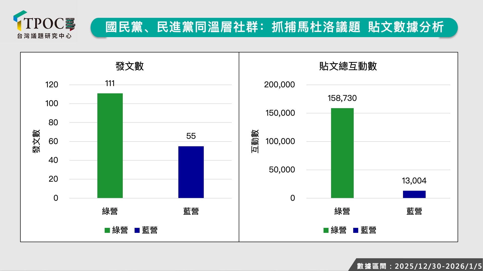 川普政府清理中南美「後院」,活捉馬杜洛夫婦,這個事件雖然遠在萬里之外,卻精準挑動台灣內部「親美VS疑美」的敏感神經。從數據面觀察,綠營社群展現極高動員效率,積極奪得論述主導權,以高達12倍的懸殊總互動數差距,將這起軍事行動轉化為支持者們的「抗中強心針」,反觀藍營社群主打「疑美」、販賣焦慮及恐懼,試圖把台灣的處境類比為委內瑞拉,同時質疑美國的行動違反國際法,但根據數據調查結果,目前這種說法仍難以擴散。