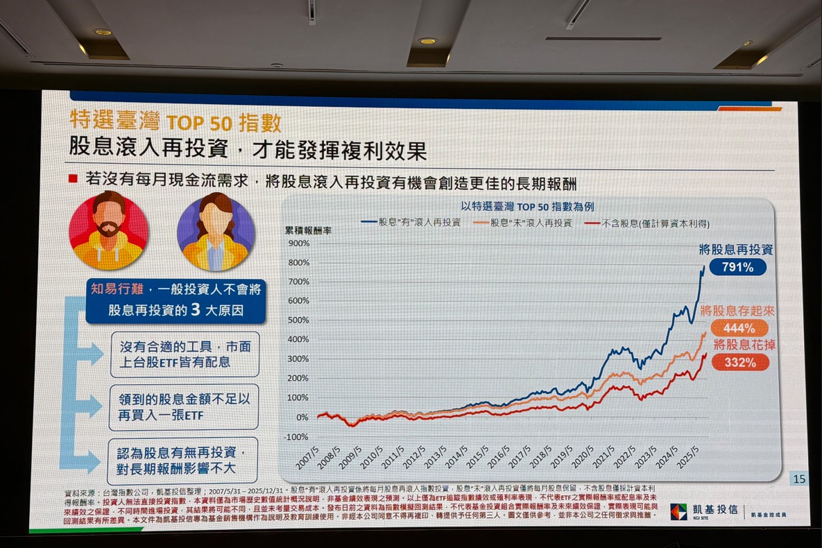 凱基投信將推出凱基台灣TOP 50(009816),同時也是市場唯一不配息的台股ETF,透過股息滾入再投資的機制設計,訴求時間複利滾雪球效應。
