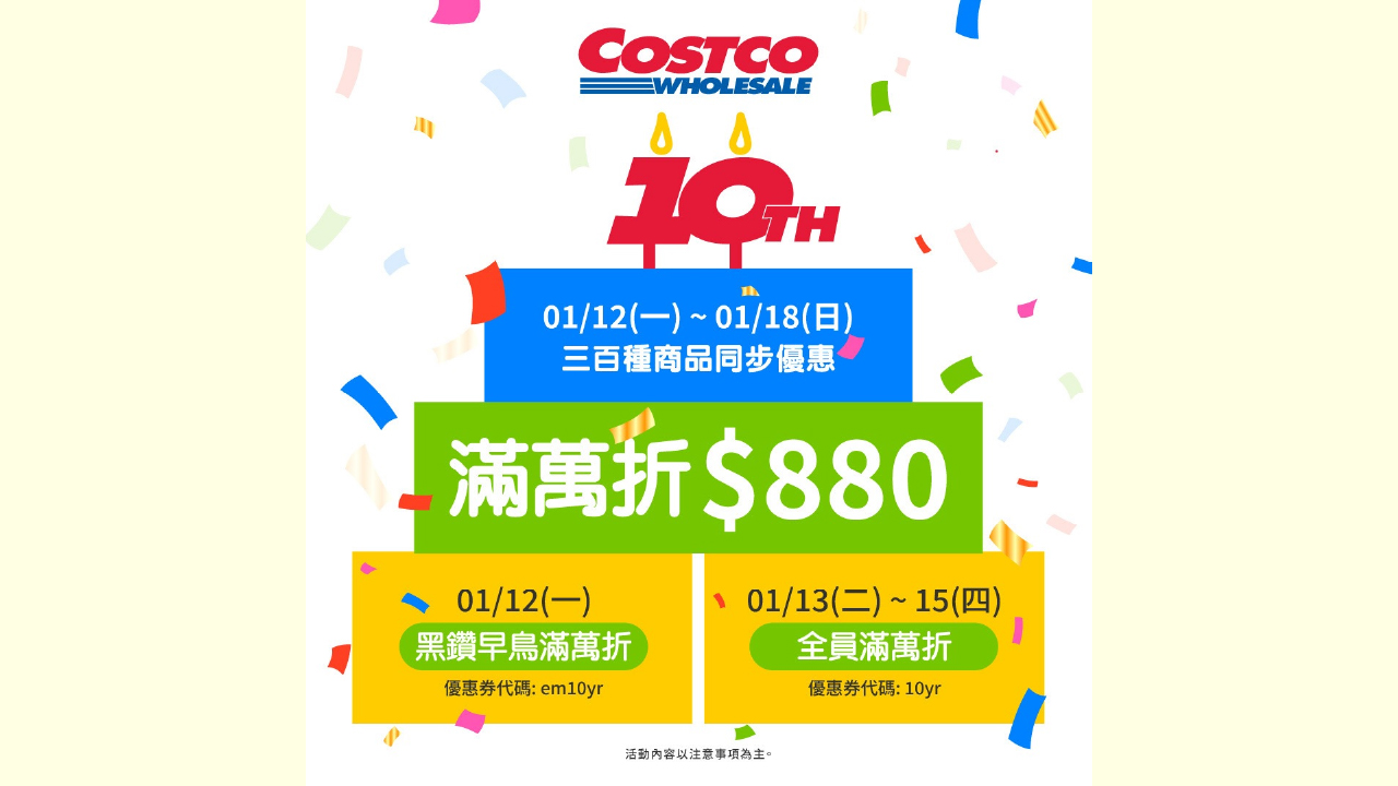 ↑圖說:好市多推出線上購物10週年慶,活動自1月12日至18日登場,12日為黑鑽會員加碼早鳥場享單筆滿萬元折880元,優惠券可加碼多用一次;13日至15日為全體會員享滿萬元折880元優惠。(圖片來源:好市多提供)
