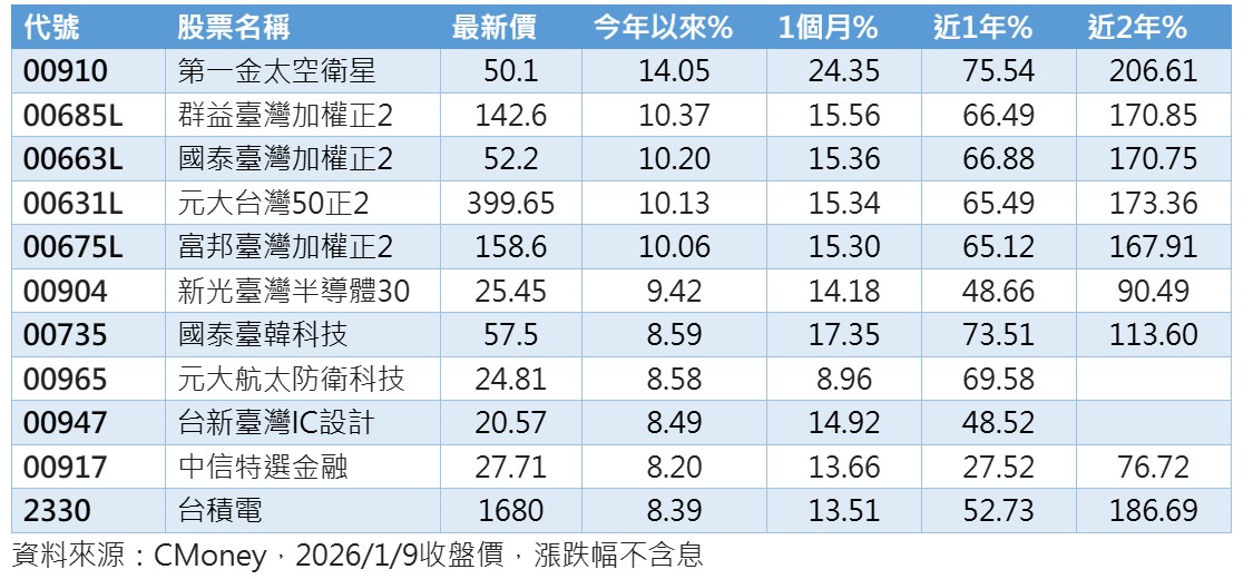 盤點今年以來績效最好的十檔股票ETF(不分海內外),漲幅8.2%起跳,其中,第一金太空衛星ETF(00910)上漲14.05%,收盤上漲2.08%,是發行以來首度站上50元,漲幅超越台積電與台股槓桿型ETF。