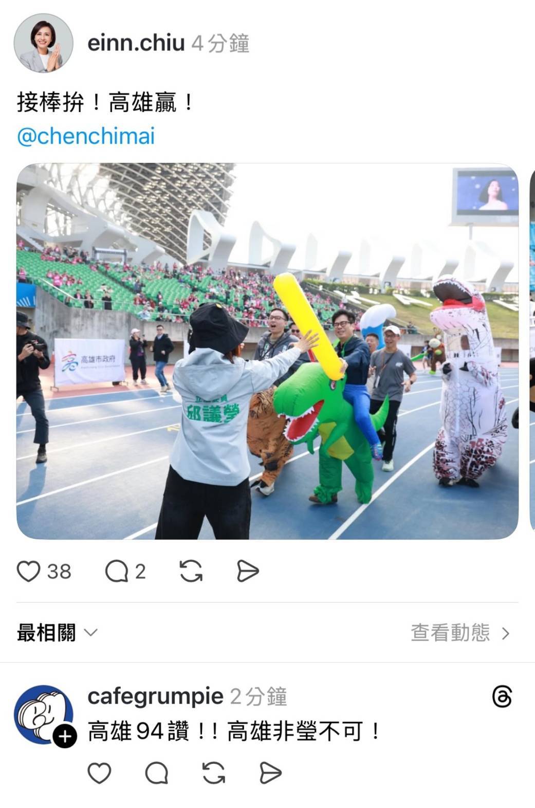邱議瑩隨後在社群平台分享趣味的接棒畫面,還有帶領高雄熊衝到終點,大喊:「接棒拚、高雄贏」。她強調,無論是在市政建設或城市未來的馬拉松賽道上,她都會全力以赴、拚到終點。她表示,若有機會承擔市長重任,將延續高雄改革的步伐,帶領城市穩健向前。