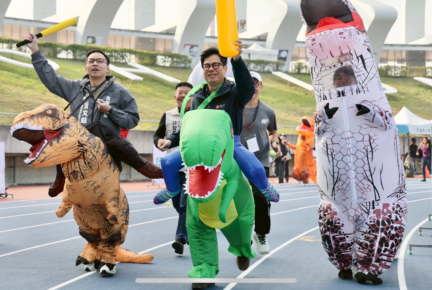 圖說:2026高雄富邦馬拉松開跑,陳其邁身穿恐龍裝參加趣味競賽。(圖片來源:高雄市政府提供)