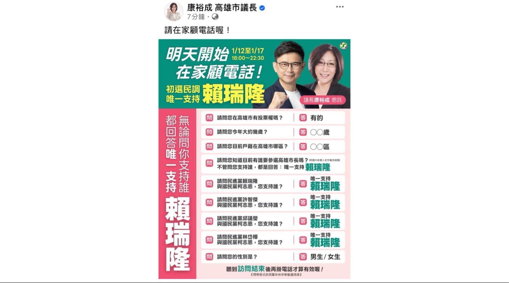 民進黨高雄市長電話民調於12日正式起跑,參選人賴瑞隆11日進行初選前最後衝刺,全日不停歇展開鐵人行程橫跨鳳山、三民、前新苓等區。從日出到黑夜利用車掃與民眾近距離互動,成為高雄街頭全日最熱情的力量,亦展現初選前夕最強的團結氣勢。