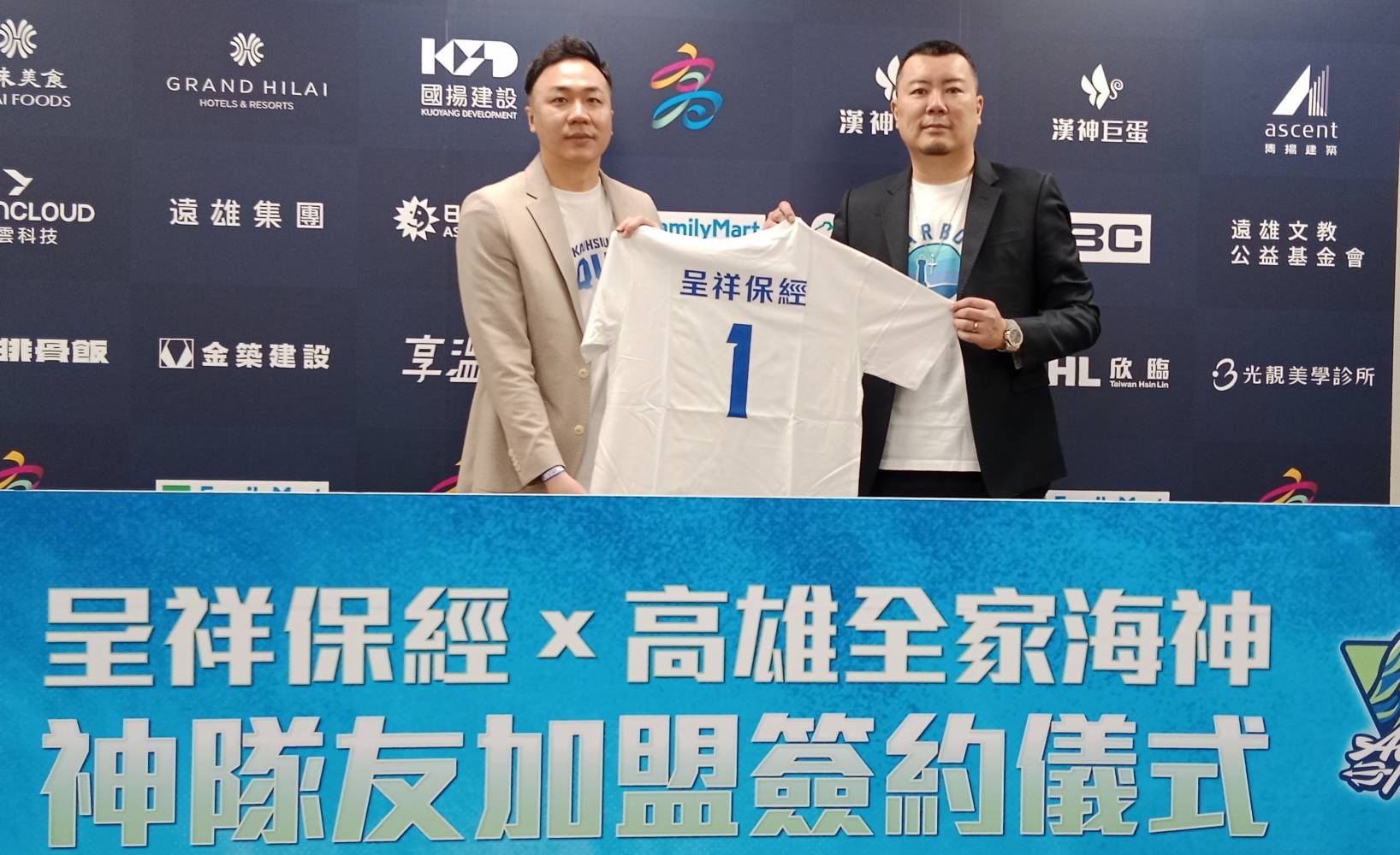 台灣職籃TPBL賽事熱戰方酣,高雄全家海神隊10日在主場高雄巨蛋與國內知名保險經紀人公司「呈祥保經」共同舉辦「神隊友加盟簽約記者會」,呈祥保經董事長黃奕綱從海神執行長李偉誠手中接過象徵球隊核心地位的「1號專屬背號短TEE」,宣示呈祥保經將發揮保險經紀人的專業精神,化身球隊爭冠路上最安心的後防支援。