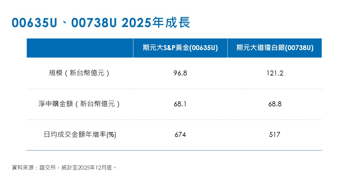 據Lipper、證交所資料,期元大S&P黃金(00635U)、期元大道瓊白銀(00738U)在2025年淨值分別上漲54.4%、125.8%,日均成交金額亦較2024年增加674%、517%,全年淨申購金額分別達到68.1億元、68.8億元,規模達96.8億元、121.2億元,同步改寫歷史新高紀錄。