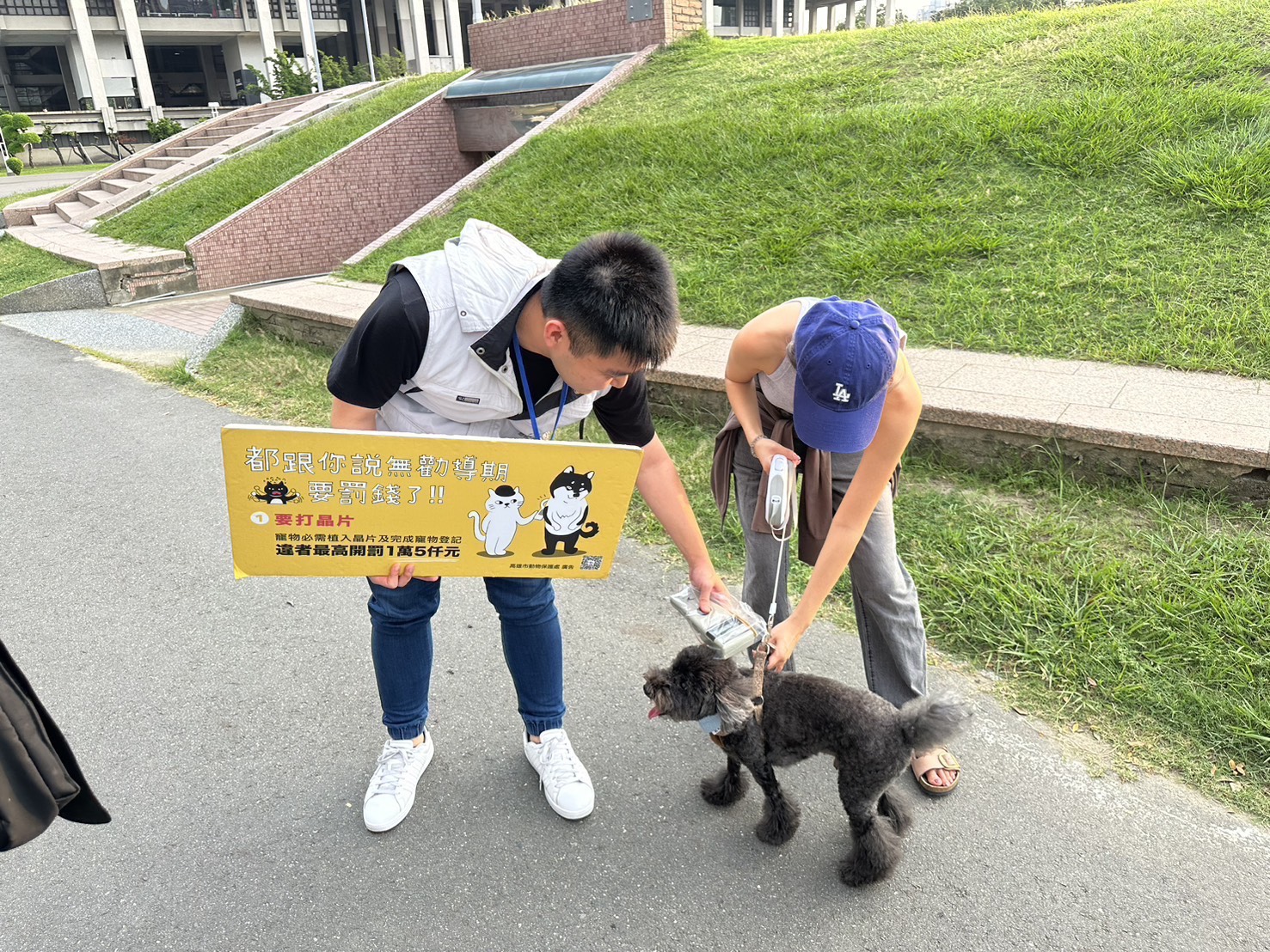 ↑圖說:動保處進行飼主責任稽查,提醒飼主務必替家中毛小孩完成寵物晶片登記、定期施打狂犬病疫苗及絕育或申報免絕育。另外,攜帶寵物出入公共場所或公眾得出入場所,應使用鏈繩、箱籠或採取主管機關公告之適當防護措施唷!(圖片來源:高雄市農業局提供)