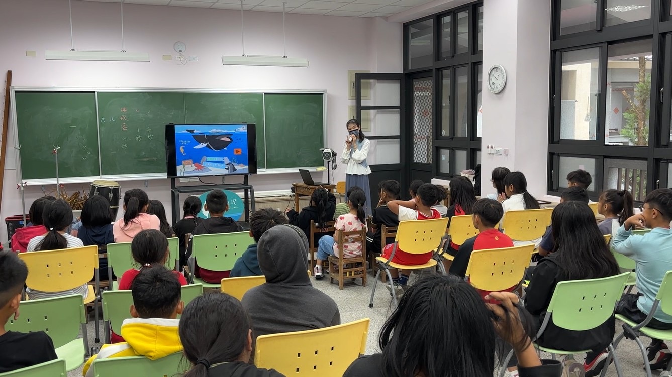 ↑圖說:黃莉娟講師於113年4月24日赴南投縣信義鄉東埔國小分享《臺灣鯨讚》繪本故事(圖片來源:海洋保育署提供)