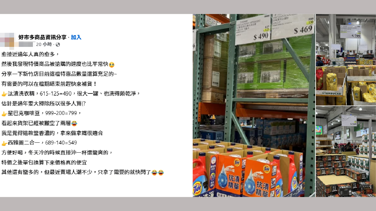 距離農曆新年剩不到兩週,各大賣場湧現採購人潮,美式賣場好市多(Costco)更是擠滿備貨民眾。有會員在臉書「好市多商品資訊分享」社團發文分享,新竹店目前特價商品被搶購速度驚人,其中星巴克咖啡豆貨架已被掃空兩層,提醒有需要的會員把握檔期趕緊補貨。