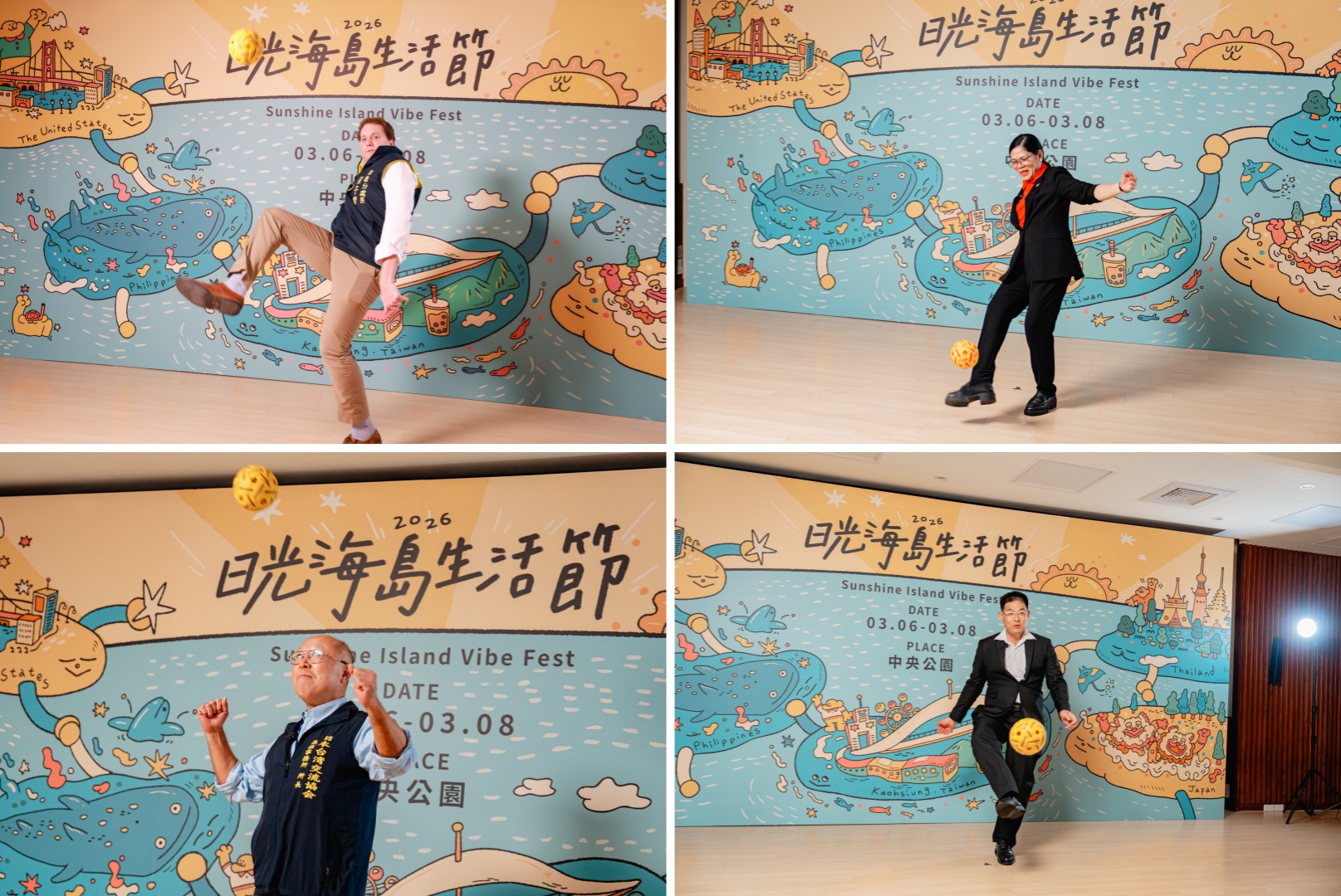 活動現場氣氛熱絡,陳其邁與四國代表輪番上場挑戰藤球,笑聲與掌聲不斷。五人更分別以中文、英文、日文及泰文接力向民眾喊話,邀請大家預留時間,一同參與規模升級、連續三天登場的日光海島生活節,親身感受異國美食與多國表演交織而成的熱情氛圍。