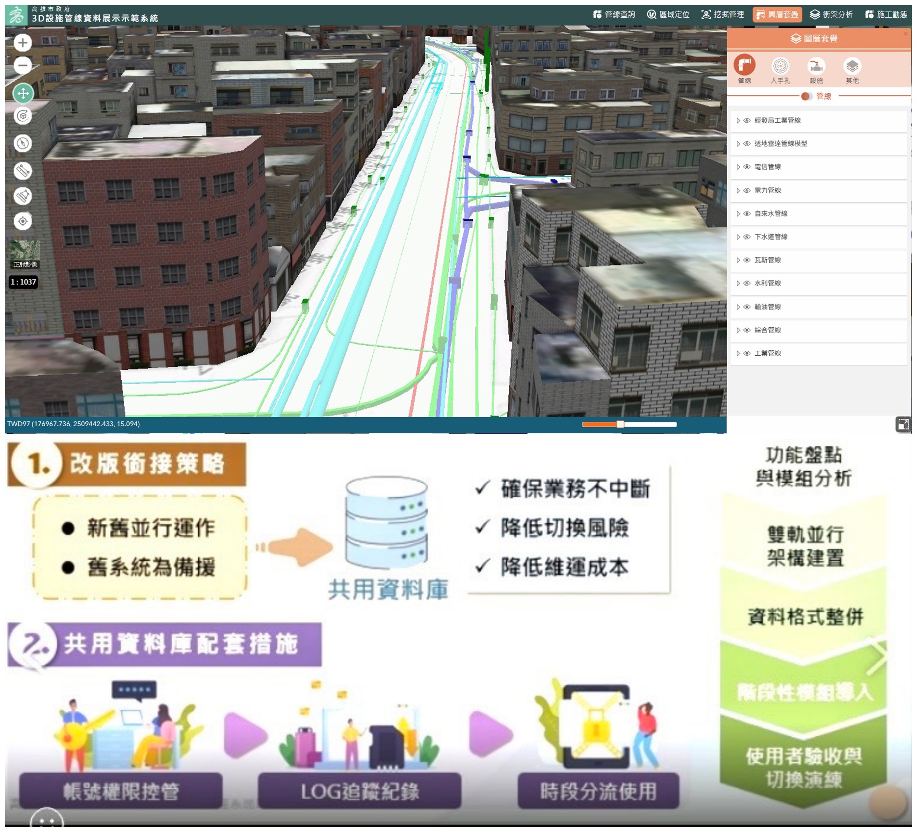 ↑圖說:高雄市政府在全市龐大地下管線環境下,榮獲公共設施管線資料庫獲全國評鑑優等,並持續強化3D圖資+AI。(圖片來源:高雄市工務局提供)