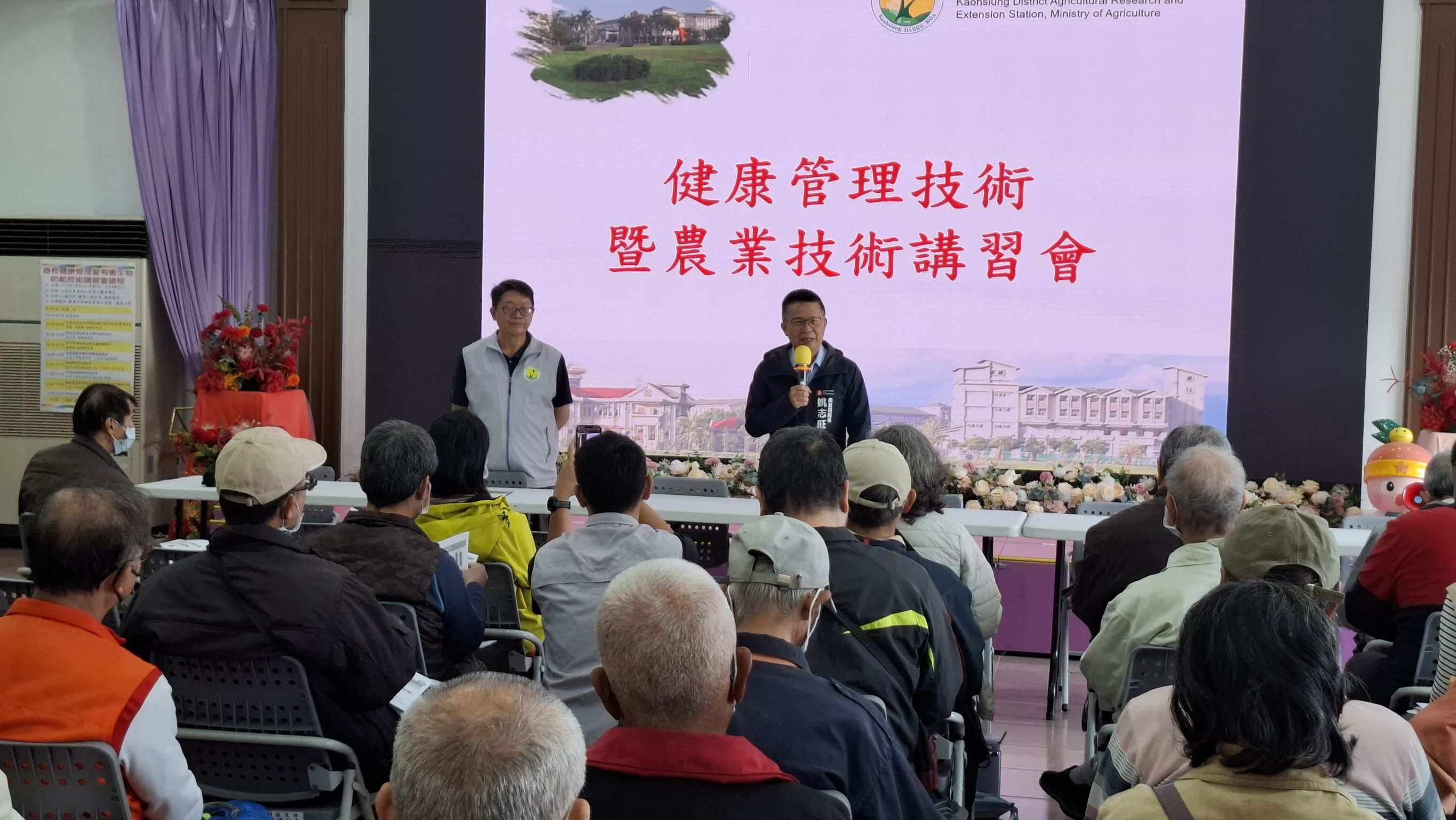 ↑圖說:「荔枝健康管理暨有害生物防範技術講習會」,除了邀請多位專家學者帶來最新荔枝種植新知外,現場吸引百餘位農友踴躍參加。農業局長姚志旺到場致詞並與農民互動。(圖片來源:高雄市農業局提供)