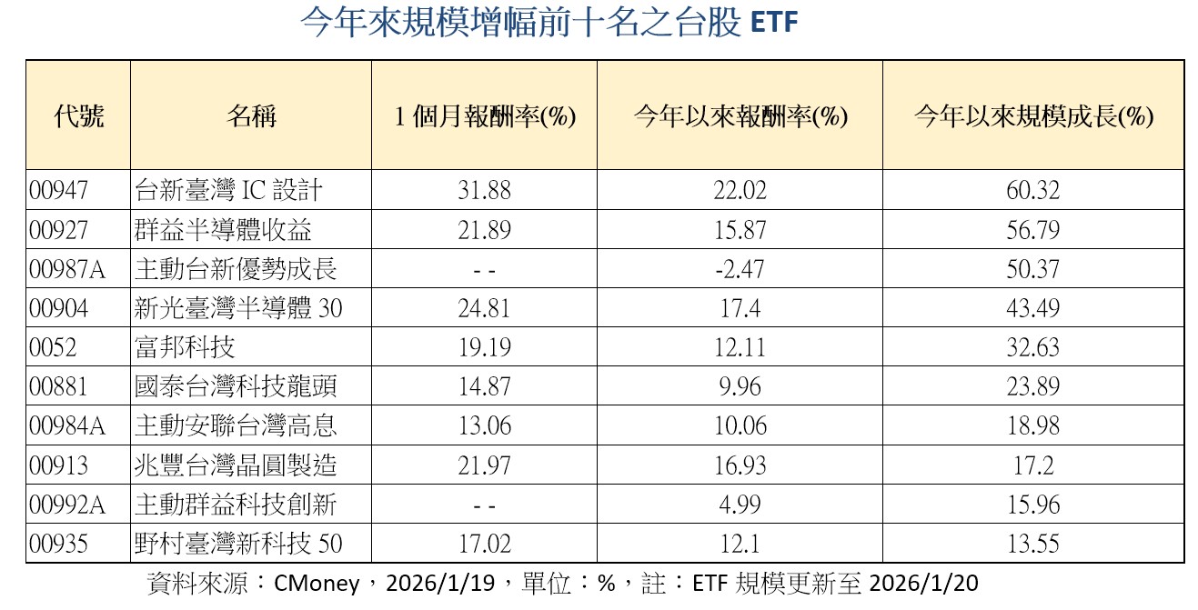 再看今年來規模增幅前十名的台股ETF,成長幅度皆高達二位數,其中,前三強台新臺灣IC設計(00947)、群益半導體收益(00927)、主動台新優勢成長(00987A)皆大幅成長5成以上。