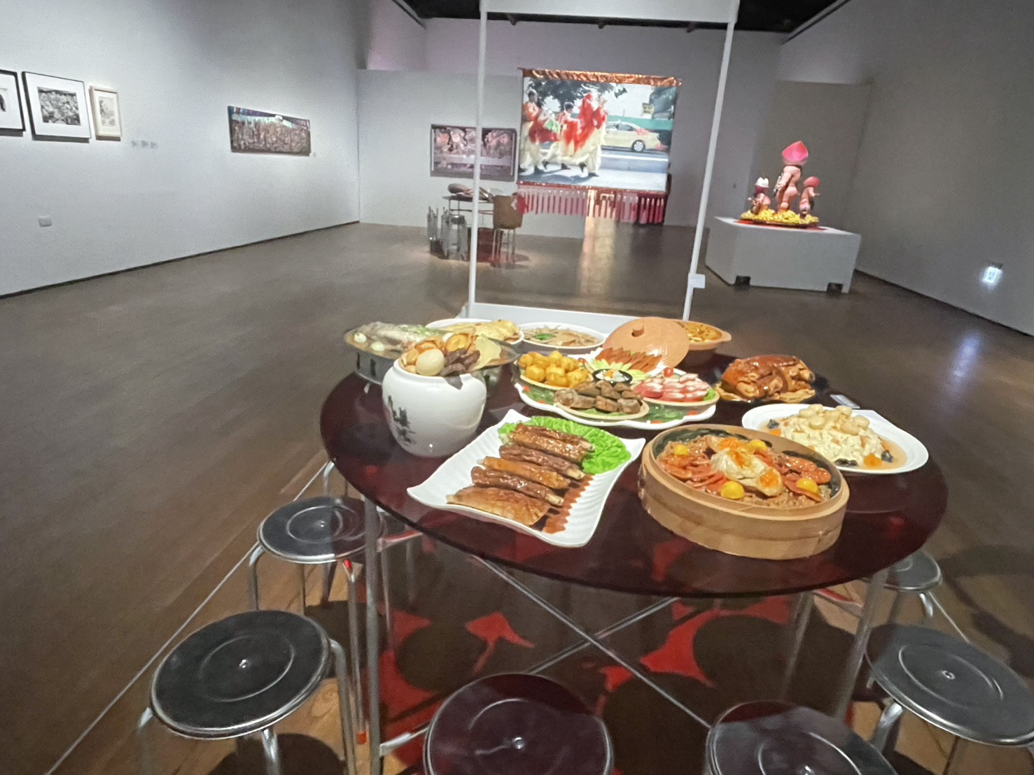 圖說:以「辦桌拼盤」為靈感的圓桌裝置,結合食物模型與藝術創作,象徵台南家庭中餐桌與神桌的文化連結。(圖片來源/記者林薇安攝)