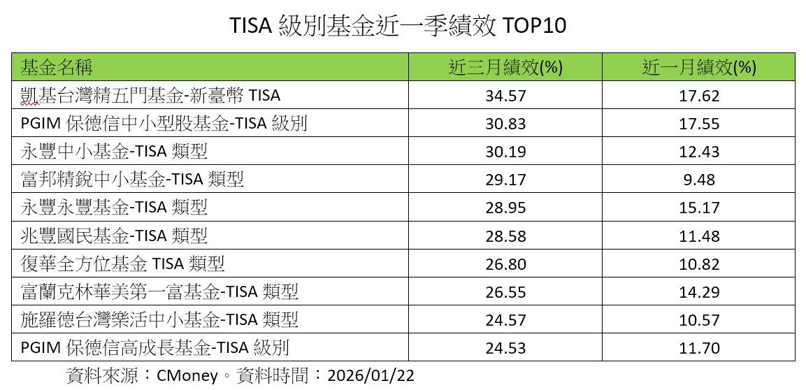 盤點TISA級別基金近三個月績效,由凱基台灣精五門基金-新臺幣TISA、PGIM保德信中小型股基金-TISA級別,及永豐中小基金-TISA類型佔據前三名,分別繳出34.57%、30.83%,及30.19%的含息報酬率。
