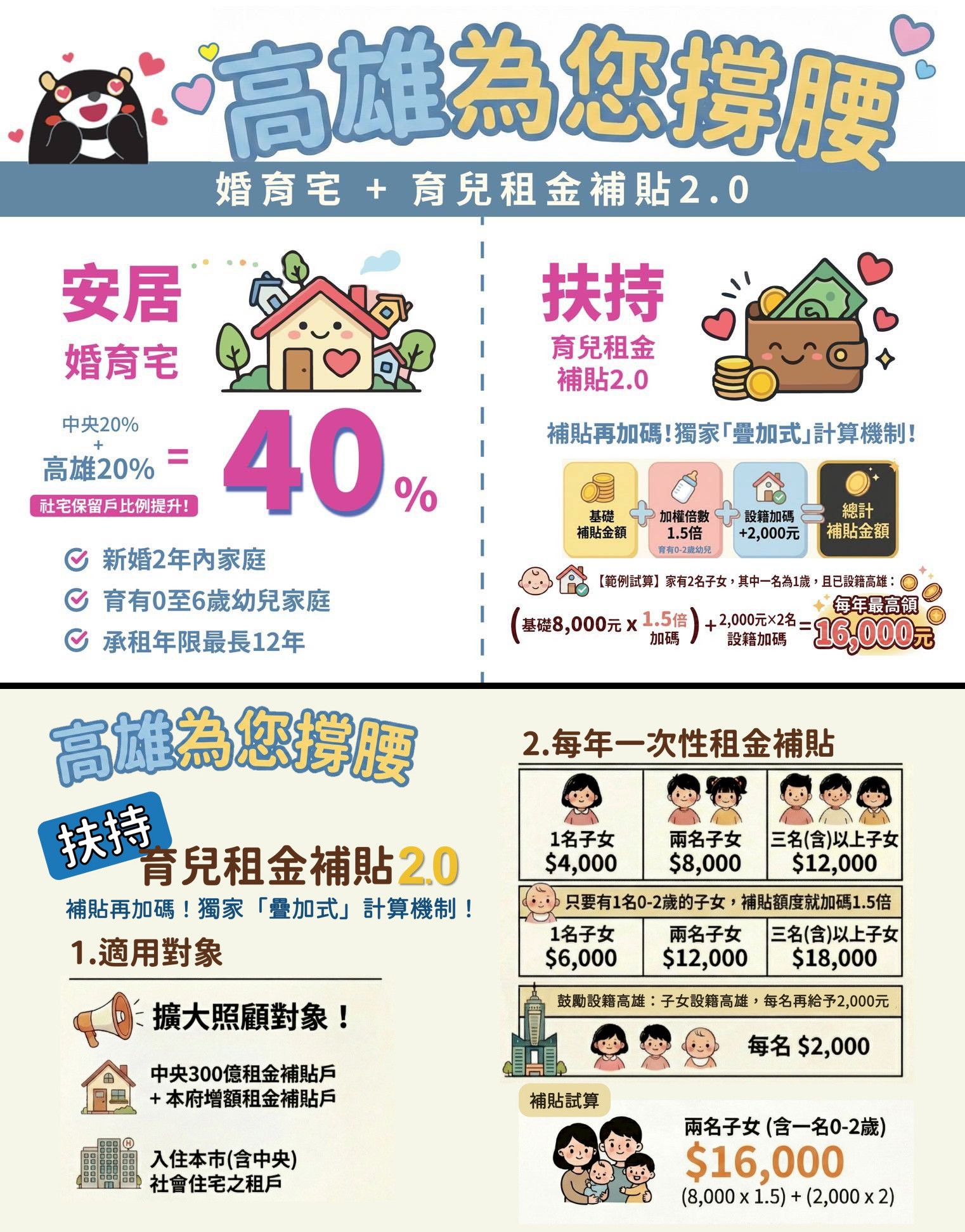 ↑圖說:高雄市「婚育宅40%」及「育兒租金補貼2.0」政策說明(圖片來源:高雄市都發局提供)