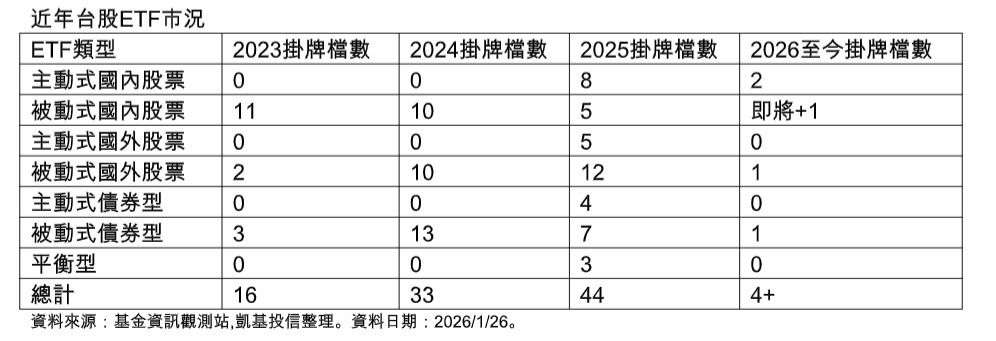 凱基投信表示,近年台股ETF市場火熱蓬勃發展,觀察近三年成立數量,掛牌台股的原型ETF總數呈現階梯式成長,包含國內外股票與債券型ETF,2023年16檔,2024年33檔,2025年進一步成長至44檔,2026年一開年,也已有2檔主動式國內股票ETF、1檔被動式國外股票ETF與1檔被動式債券型ETF掛牌,預計隨著AI進入應用與生產力爆發關鍵元年,台股市場可望躍升世界金融市場主舞台,台股ETF市場熱度也將進一步升溫。