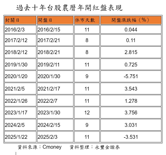歷史資料統計顯示,2016年至2025年的10年間,台股農曆春節後開紅盤,上漲機率高達八成,平均報酬率約0.6%,其中以2023年開盤日大漲3.756%最亮眼。
