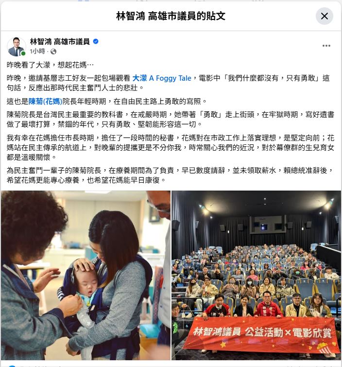 ↑圖說:觀賞《大濛》後,林智鴻也在社群平台分享觀影心情,提到電影讓他聯想到監察院長陳菊年輕時投身民主運動的身影。(圖片來源:擷取自林智鴻臉書)