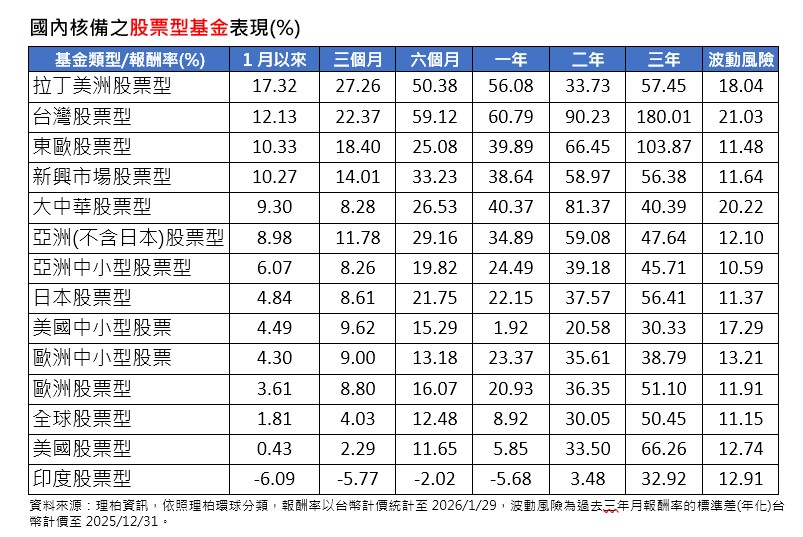 主要區域股票型基金來看,AI半導體與商品市場帶動新興國家股市強勁上漲,拉丁美洲、台灣、新興市場股票型基金,1月平均漲幅分別達17.32%、12.13%和10.27%,表現也不弱。