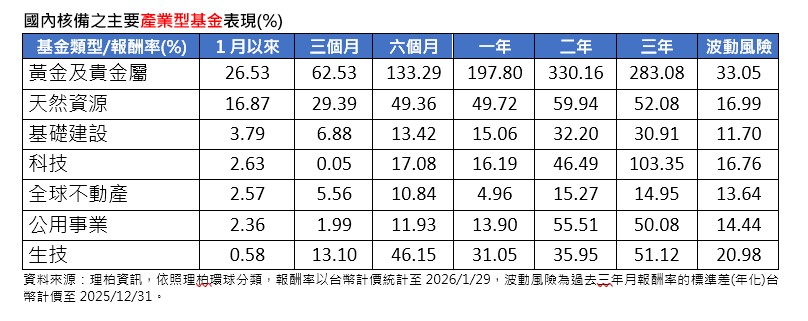 主要產業型基金方面,黃金貴金屬股票型基金依舊強強滾,元月平均上漲26.53%,持續稱霸各類基金。