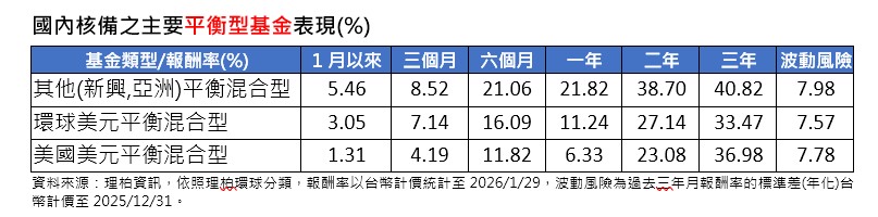 主要平衡型基金部分, 1月股市普遍勁揚,帶動各類平衡型基金表現,由於美元貶值、主要貨幣升值的匯兌貢獻,新興市場或亞洲等其他平衡型基金平均大漲5.46%領先;環球美元平衡型基金也有3.05%漲幅,缺少匯兌浥注的美國美元平衡型基金僅上漲1.31%。