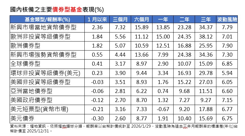 主要債券型基金部分,1月美元貶值,有匯兌收益挹注的新興市場當地貨幣債券型平均上漲2.36%領先,歐洲系列債券型基金漲幅居次。反觀美元計價的債券投組基金表現居後。