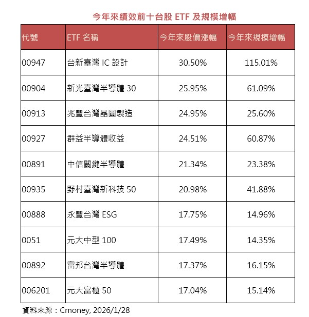 今年以來績效前10強的台股ET,不僅漲幅皆高達2位數,規模成長率亦同步達2位數。其中,台新臺灣IC設計(00947)受惠於記憶體及IC設計大漲帶動,今年來股價大漲逾3成,不到一個月規模翻倍,表現亮眼。
