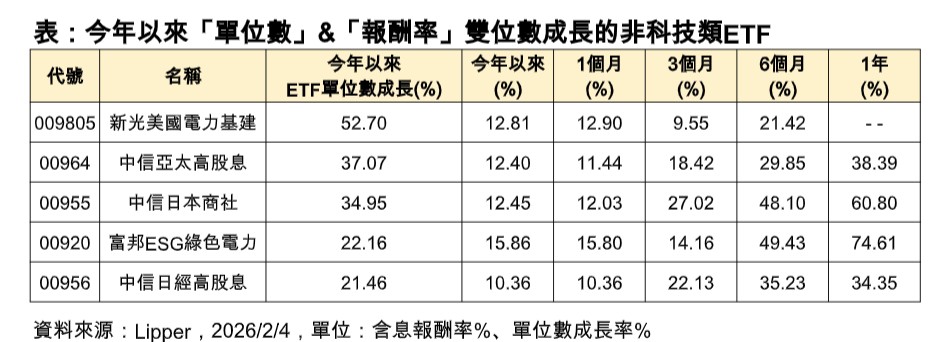 其次為中信亞太高股息(00964)與中信日本商社(00955),年初迄今單位數也成長逾3成,另外一檔富邦ESG綠色電力(00920),同樣屬電力主題,1月以來單位數也成長逾2成。