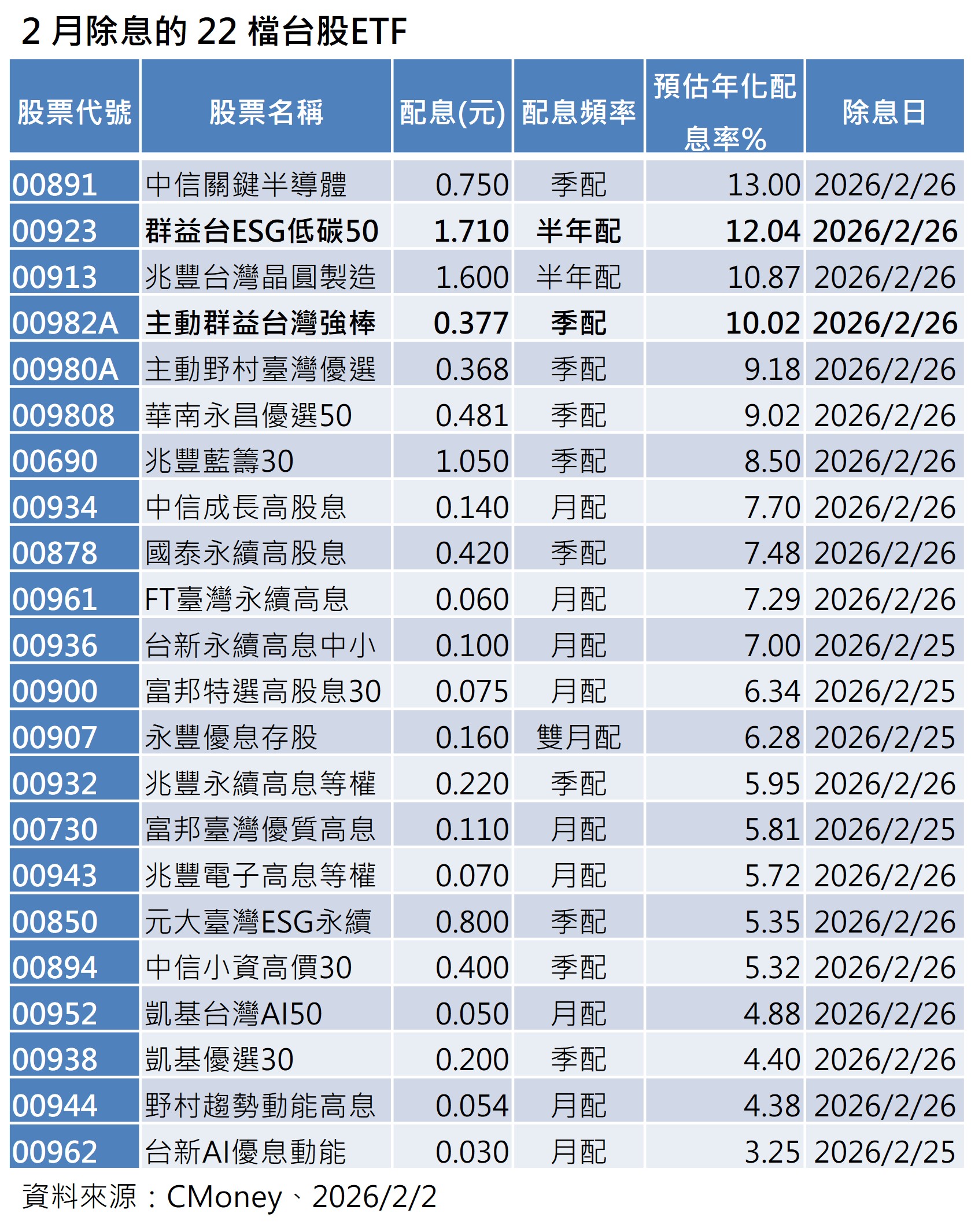 觀察2月除息的台股ETF,包括配息金額最高的群益台ESG低碳50(00923)、以及主動式台股ETF配息王:主動群益台灣強棒(00982A),以及國民ETF:國泰永續高股息(00878)等熱門台股ETF都在列。
