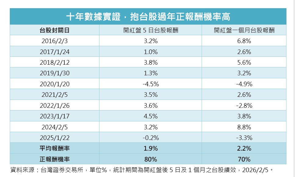 據統計,過去十年,台股開紅盤後五日的正報酬機率高達八成,平均漲幅1.9%,若拉長至一個月,正報酬機率也有七成,平均漲幅達2.2%。
