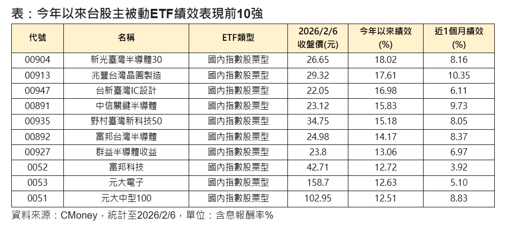 從盤面來看,今年1月以來表現最好的台股ETF前10檔,績效12.5%起跳,其中有6檔是半導體相關ETF,進一步來看,新光臺灣半導體30 ETF(00904)以含息報酬18.02%居冠,大幅超越同期間加權指數的9.73%;兆豐台灣晶圓製造(00913)、台新臺灣IC設計(00947)兩檔,也分別上漲17.61%、16.98%,緊追在後。